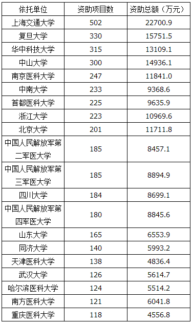 医学科学学部前20名中上海交通大学排名榜首,获批项目总数为502项,资助总额为22700.9万元。