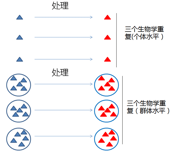 我们再来回顾一下生物学重复和技术重复的定义。生物学重复指不同生物样本做同样实验,就是实验本身用不同的样本重复三次。技术重复是指对一个生物样本的实验指标测定多次,就是对每个材料的实验数据平行测三次。