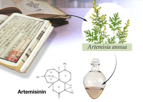传统治疗疟疾的药物为氯喹和奎宁,但治疗效率越来越低,截至 20 世纪 60 年代,科学家努力根除疟疾的想法失败了,随后疟疾感染不断增加,就在此时,中国科学家屠呦呦转向寻找传统中药来开发抵御疟疾感染的新型疗法;通过对大量中草药进行大规模筛选以及在疟疾感染的动物身上进行试验,一种从植物青蒿中提取的物质表现出了巨大潜力,然而所得到的结果在一致性上却出现了问题。为此屠呦呦重新查阅古代资料并且修改了方法,最终发现了一种提取青蒿素(青蒿提取物)的新方法,她首次发现了这种名为青蒿素的化合物,实验证明青蒿素可有效抵御寄生虫感染,在感染动物和人类中都表现出了较好的疗效(见 Fig4 )。