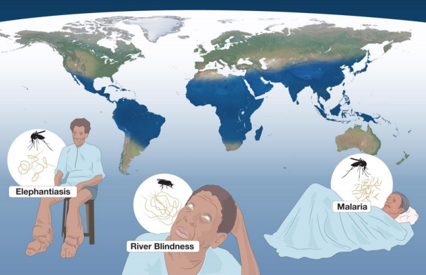 Fig1 : 2015 年诺贝尔生理学或医学奖授予给开发抵御致死性寄生虫病疗法的三位科学家,三种严重的寄生虫病分别为:河盲症、淋巴丝虫病及疟疾,这三种疾病的分布比较相似,详见图中蓝色区域。