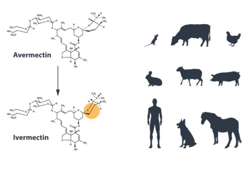 研究者 William C. Campbell 是一位美国致力于寄生虫研究的科学家,其获得了 Satoshi Ōmura 的链霉菌培养基,并且放大了这种链霉菌的效力; Campbell 指出,一种来自链霉菌培养基中的特殊组分可以有效抵御家养和农场动物身上的寄生虫感染,研究者将这种生物活性制剂进行了提纯,并且命名为阿维菌素,对其进行一定的化学修饰就可以变成一种名为伊维菌素 (Ivermectin) 的高效化合物了,伊维菌素 (Ivermectin) 在人类和动物试验中均可以高效杀灭大量寄生虫(见 Fig3 ),总的来讲,科学家 Ōmura 和 Campbell’s 的研究成果为开发高效抵御寄生虫疾病的新型药物带来的希望。