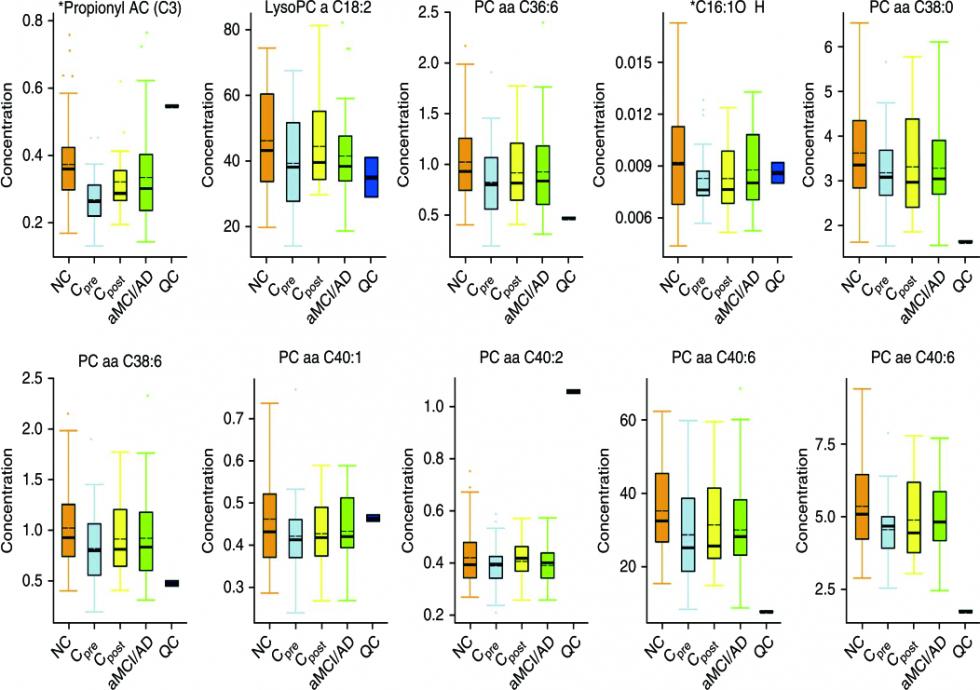 阿尔茨海默病又称老年痴呆症,会引发记忆力减退、认知能力下降等,临床上还没有治疗的方法,并且难以在发病前预测。目前预测该疾病的生物标记物由于是侵入式的、并且耗时耗费,不适合于应用推广。本文利用代谢全谱和靶向代谢组技术,对53个阿尔茨海默病病人和53个健康人对照的外周血进行代谢物的检测和生物标记物的挖掘,发现10种代谢物,包括卵磷脂、酰基肉碱和溶原性卵磷脂,在发病组中的含量显著比健康对照组低(图2)。这些脂类代谢物被报道与脑细胞膜的完整性密切相关。对这10种脂类代谢物在另一份疾病样品中进行独立交叉验证,检测出的代谢物水平与之前的实验结果相似,说明这些代谢物可作为阿尔茨海默病早期预防诊断的生物标记物,可提前2-3年预知疾病风险,准确率高达90%。