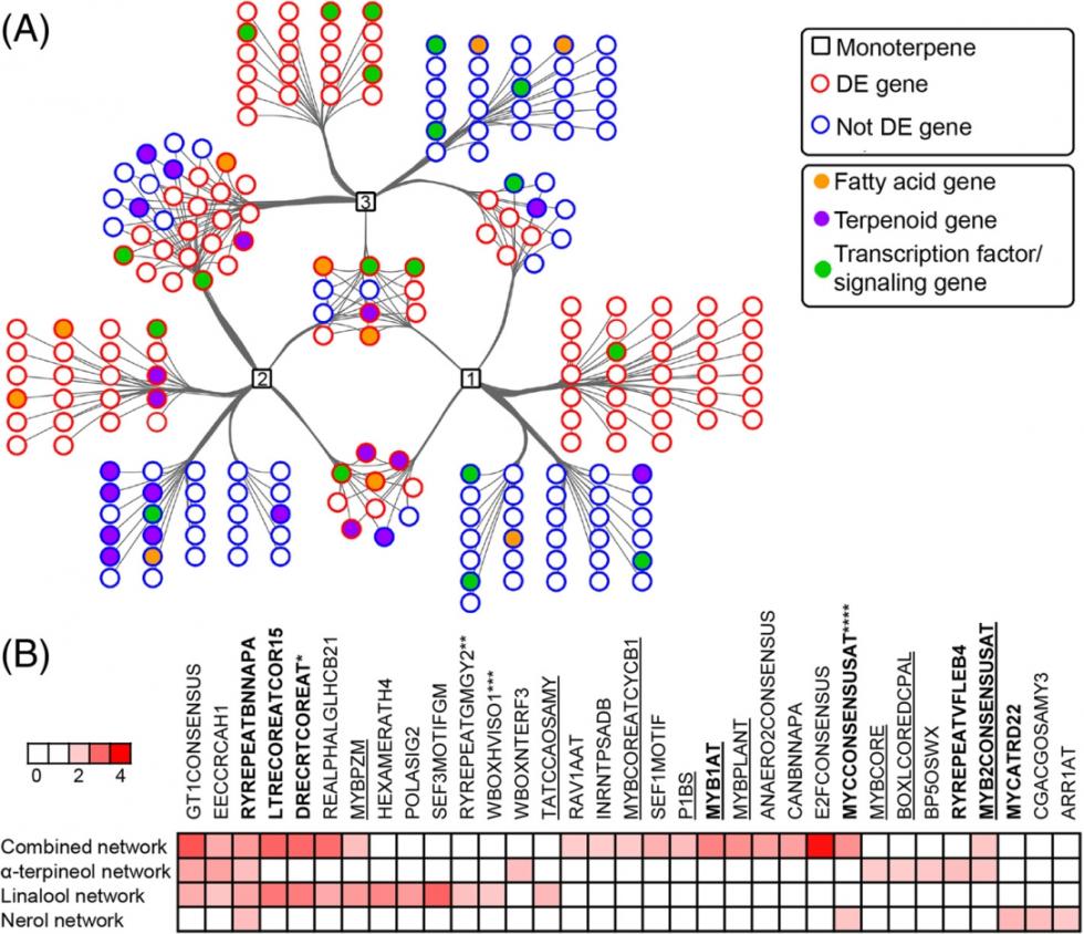 图1 A:芳樟醇(1)、alpha松油醇(2)、橙花醇(3)的基因-代谢物调控网络。圆形代表基因。B:调控网络中基因的启动子顺式调控元件富集分析。粗体的顺式调控元件代表与干旱/ABA应答相关,下划线顺式调控元件代表MYB结合位点。